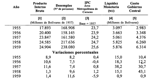 El gobierno de Marcos Pérez Jiménez disminuyó el desempleo de 8,2% en 1955 a 7,4% en 1957, lo que demuestra que la Junta no heredó una situación de paro en ascenso como se ha hecho creer, ni la administración nacionalista falló en esta área. En tan solo un año, el número de desempleados aumentó a 9,6%, resultado de la incapacidad de la Junta para dirigir correctamente el destino de los venezolanos. El Producto Interno Bruto, que presentaba un alto crecimiento de 11,6%, cayó abruptamente a 1,3%. El gasto subió un 43,1%. El incremento del índice de precios en el área metropolitana fue mayor en el periodo 1958-1959 que en los años anteriores. Resulta verdaderamente sorprendente, por lo distante a lo que sucedió en realidad, que estas políticas ejecutadas por el gobierno siguen presentándose como la salvación al deterioro del estado económico de la población, a pesar de sus graves consecuencias para el país.