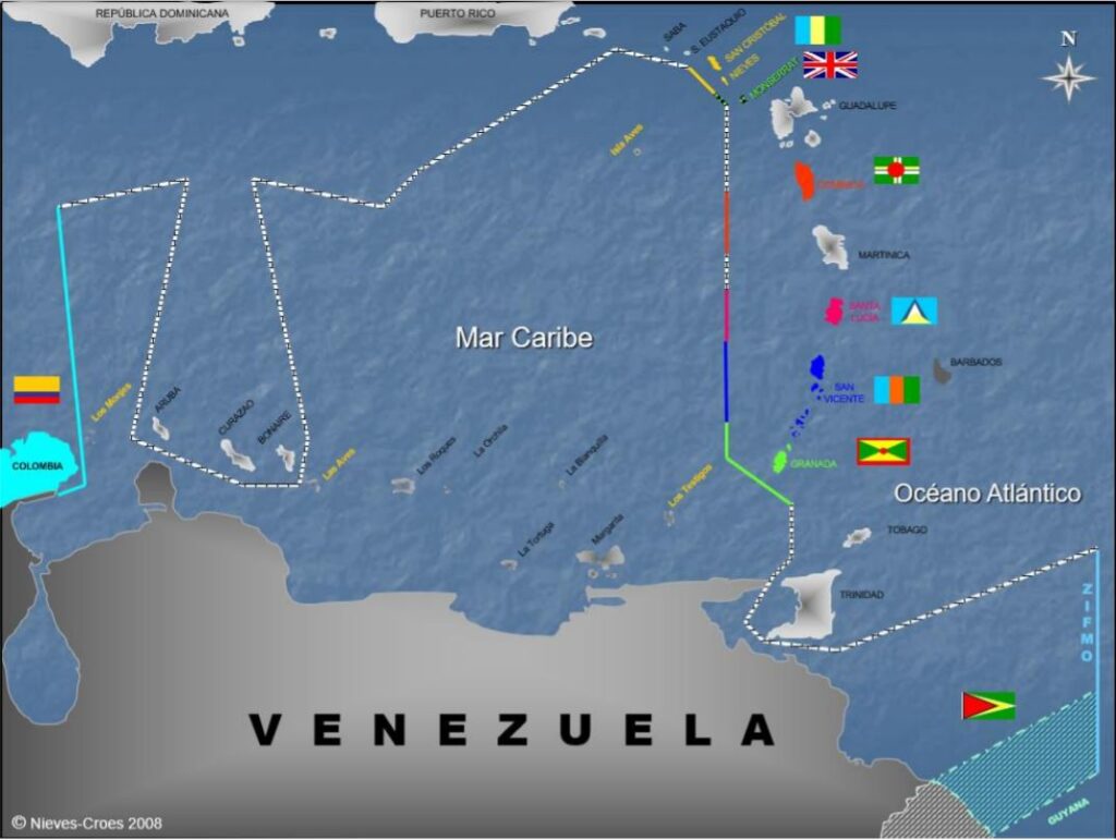 Hasta ahora se ha descrito la configuración limítrofe en el espacio terrestre, pero es mandatorio entender que Venezuela es un país continental-marítimo, con dos litorales abiertos simultáneamente, hacia el mar Caribe y hacia el océano Atlántico, situación que exige definir hasta dónde llega la jurisdicción del Estado venezolano sobre estas áreas. Para ello, Venezuela se volcó desde finales de la década de los 70 y hasta inicios de la década de los 90, a entablar negociaciones directas con sus vecinos, vale destacar la delimitación con Países Bajos a través de Aruba, Curazao, Bonaire, Saba y San Eustaquio (1978), Estados Unidos a través de Puerto Rico (1978), República Dominicana (1979), Francia a través de Guadalupe y Martinica (1980) y Trinidad y Tobago (1990), siendo ésta la última delimitación concretada (ver imagen 3).